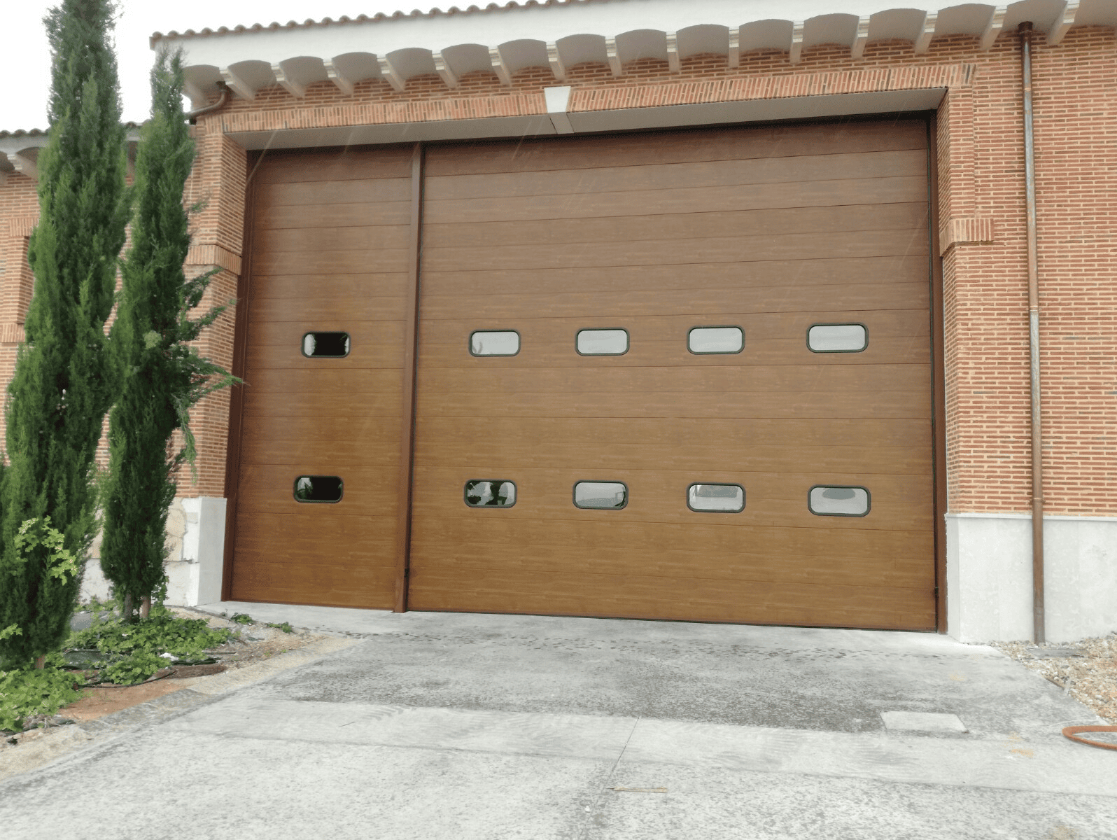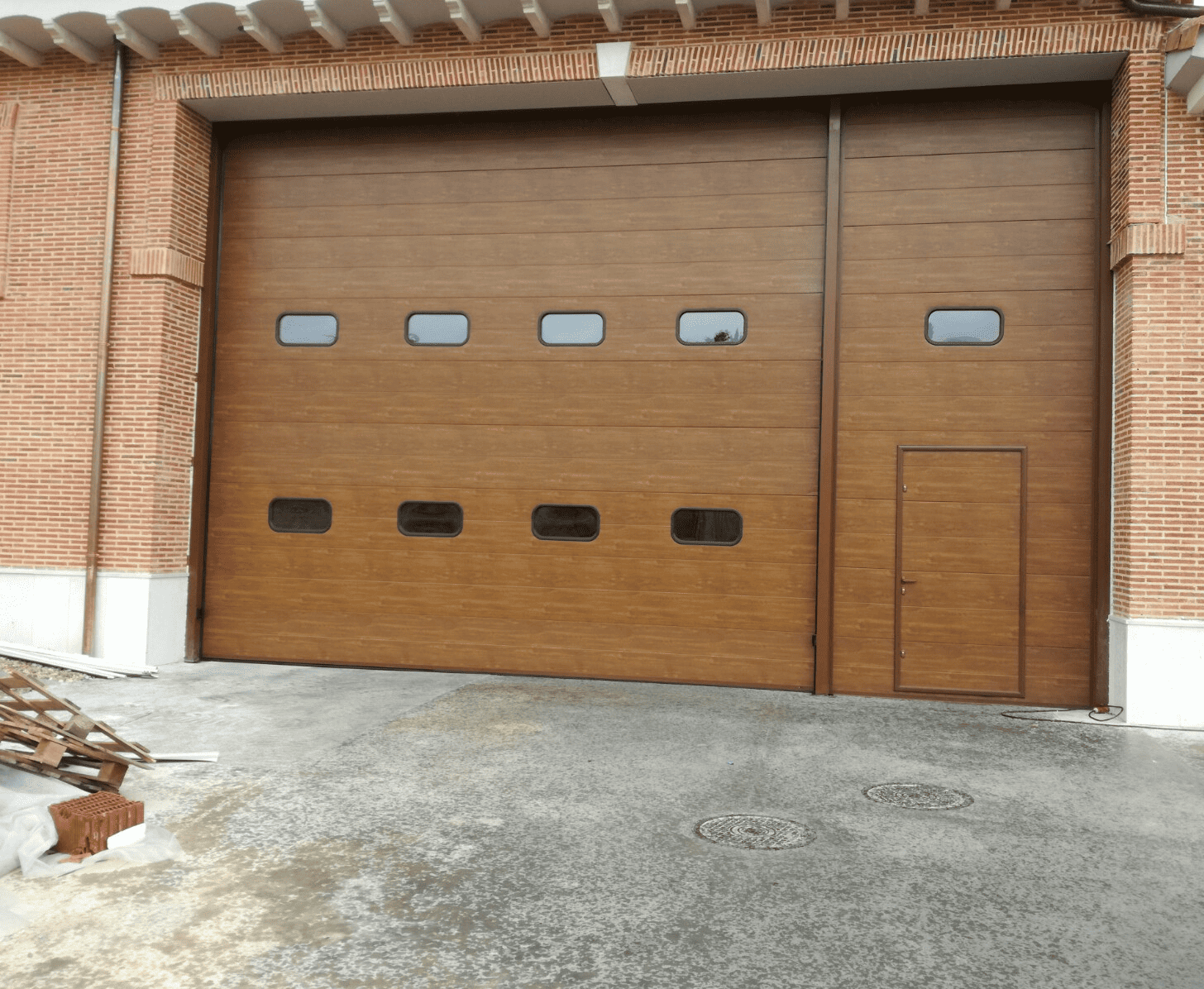 Este proyecto muestra la instalación de una puerta seccional automática de grandes dimensiones, ideal para naves industriales o espacios que requieren un acceso amplio y seguro. El acabado imitación madera aporta un aspecto elegante y moderno, mientras que la puerta peatonal integrada ofrece mayor comodidad sin comprometer la resistencia ni la seguridad. Una solución que combina durabilidad, estética y practicidad en un solo sistema.